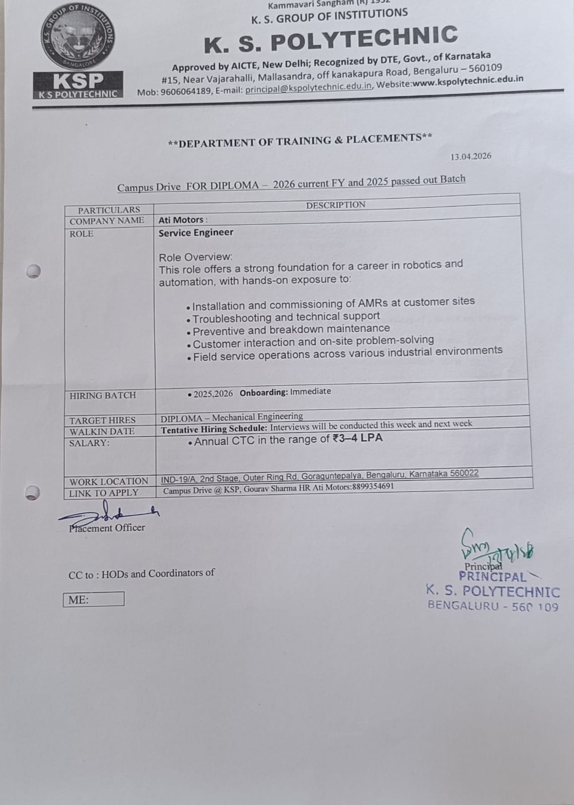 View more"The Department of Computer Science, in association with the Training & Placement Cell, successfully organized a Campus Recruitment Drive at K. S. Polytechnic in collaboration with Toyota Kirloskar Auto Parts (TKAP). The session offered students valuable insights into industry requirements, career opportunities, and the recruitment process, serving as an important step toward their professional growth and placement readiness."