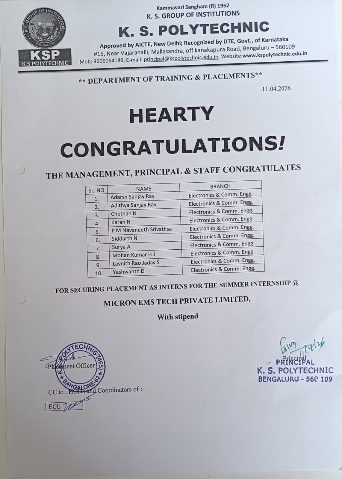 Placement cell of K S Polytechnic is continuously striving to enable our students to grab the abundant world wide job and entrepreneurial opportunities. It helps the diploma engineers to explore placement opportunities in the vast corporate and research oriented global world. It provides a platform for students to interact with various academia, organization and R&D department. The students are given opportunities for internships and all the job aspirants have been successfully placed in reputed companies.The Placement Cell at K S Polytechnic stands committed to providing the best possible placement assistance.
