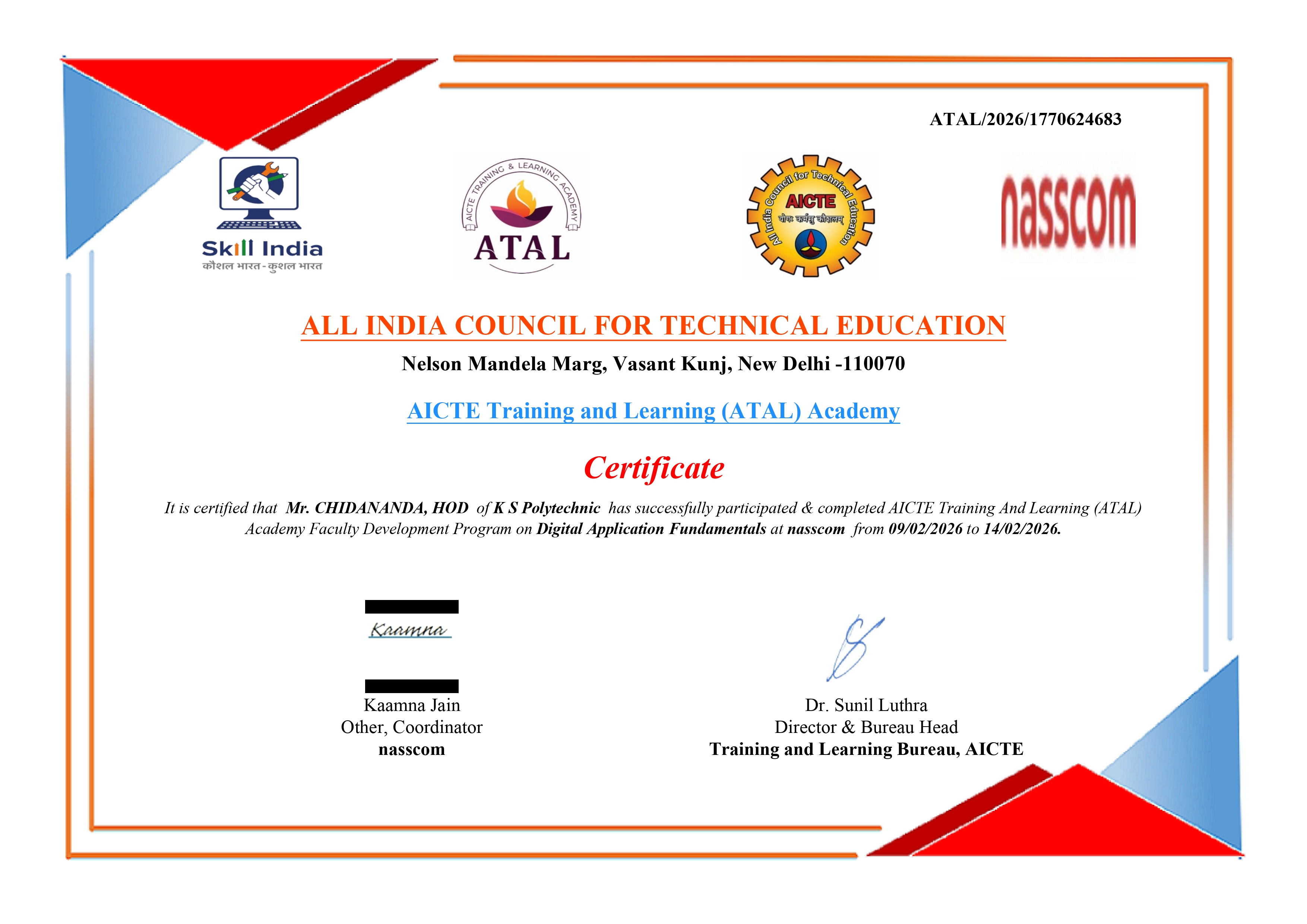 Mr. Chidananda attended 5 Days FDP on Digital Application Fundamentals conducted by ATAL Academy, AICTE [view here]