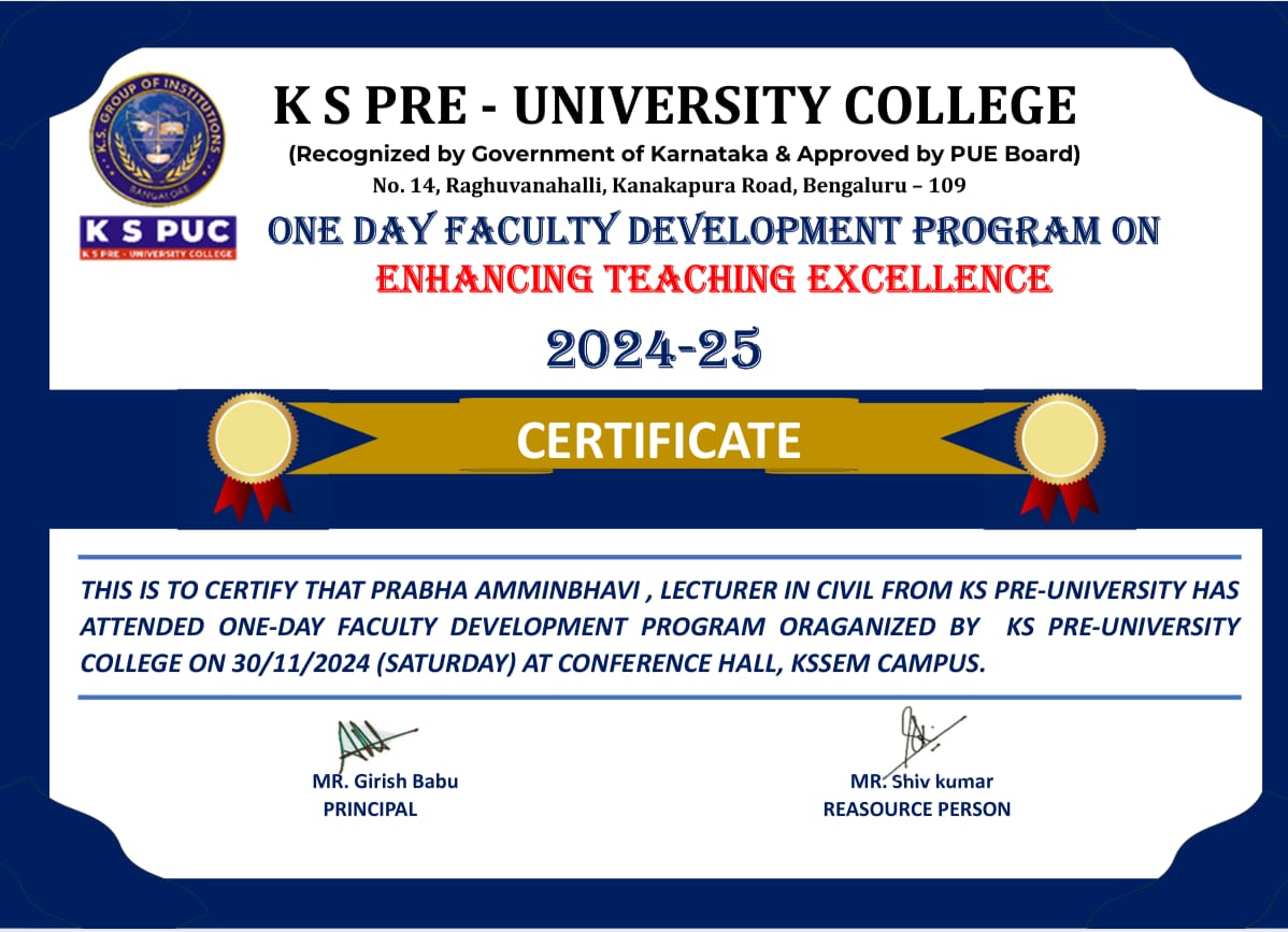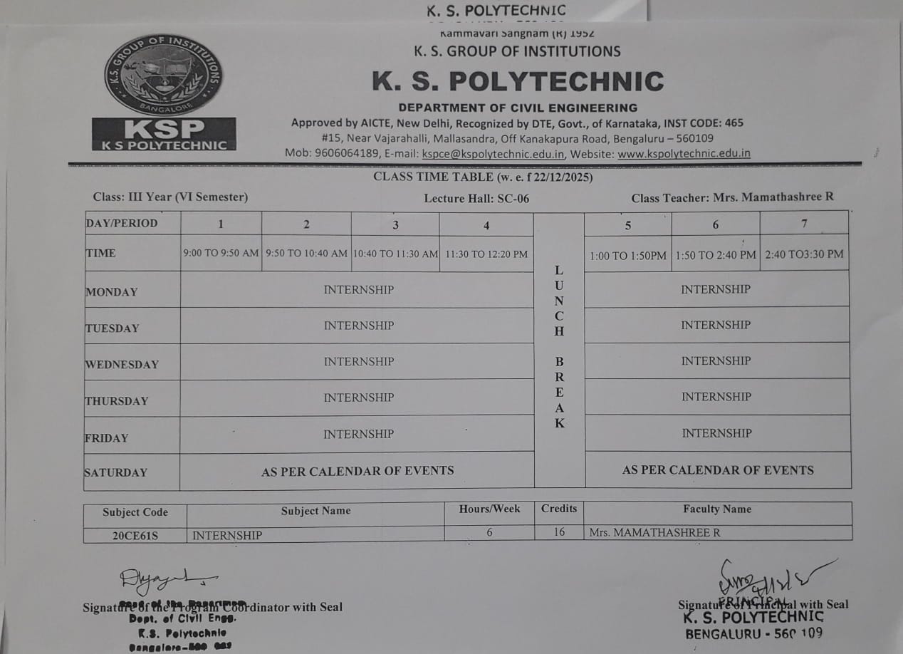 Civil Engineering in K S Polytechnic was started in the year 2004, with intake of 45 students with well-furnished Laboratories and classrooms. The intake was increased to 60 for next batch. The first batch of students were passed out in the year 2007 with flying colours and Many of them have completed the course with distinctions. Our Alumni are working in prestigious construction companies like ACC, Mantri developers and Shobha developers, Prestige and the recently passed out students are studying in topmost Engineering colleges.